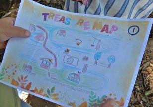 地図上には、木の板に文字が書かれたアイテムが隠された3箇所がシールで示されており、その木の板の文字は3つ集めると一つの単語になります。